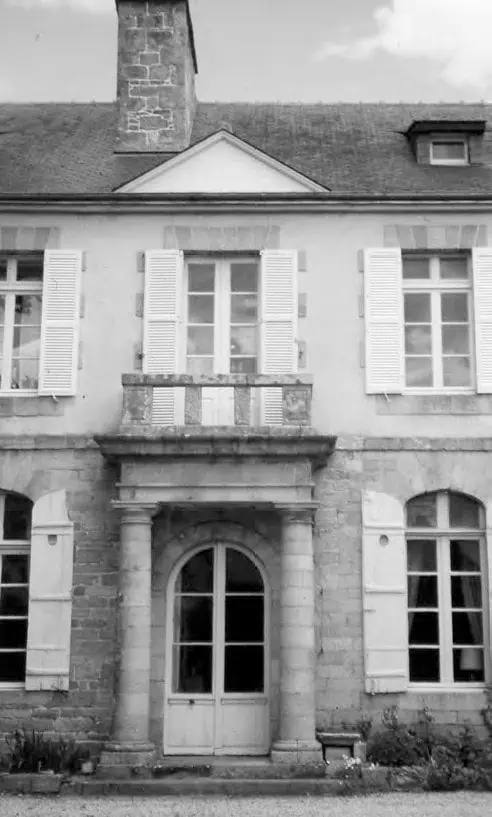 Deux colonnes lisses (socle et chapiteau doriques) supportent sur un entablement de pierre le balcon du premier étage. L’étage est séparé du rez-de-chaussée par un étroit bandeau de pierres de taille. Il est crépi. Ses fenêtres et sa porte-fenêtre au centre se superposent exactement aux ouvertures du rez-de-chaussée. Elles sont bien encadrées de granit, ainsi que les deux angles des extrémités du bâtiment, et sont sans doute du XIXe. La toiture est une longue bâtière très régulière : chaque pignon supporte une cheminée ainsi qu’un mur de refend légèrement décalé vers l’ouest par rapport au porche.
