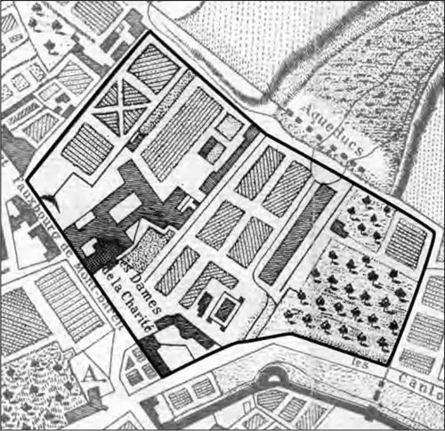 Les bienfaiteurs du nouveau couvent jetèrent d’abord leur dévolu sur un terrain situé dans le haut de la ville, en dehors des fortifications, près de la porte de Rennes. Mais le duc de Vendôme l’avait promis aux hospitalières… C’est finalement le faubourg de Montbareil, alors « mal fréquenté », qui fut choisi. Mme des Arcis, « faisant pour les sœurs de Notre-Dame de Charité de Rennes », s’occupa d’acheter maisons et terrains à partir de l’été 1676.