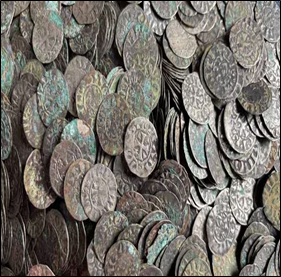 Après examen, il situa la date de l’enfouissement aux années 1180 et il retient plus précisément l’année 1184. Il parvient également à déterminer la provenance de ces pièces : celles-ci seraient majoritairement issues d’une frappe réalisée à Guingamp par Étienne Ier, comte de Trégor, de Guingamp puis de Penthièvre (v.1060-1138), fondateur de l’abbaye de Sainte-Croix par ailleurs2. Du Trégor au Léon il n’y a qu’un pas, ou presque. Si nous ne connaissons pas les raisons qui ont poussé les propriétaires à enfouir ces pièces, cette heureuse découverte permet aux Bretonnes et aux Bretons de contempler une partie de l’histoire financière du duché3. L’expertise contemporaine des pièces apprend que l’on pouvait vivre avec toute une année sans problèmes financiers avec ce trésor4.